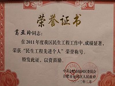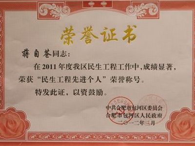 城投公司葛亚玲、蒋自仓两位同志在2011年度包河区民生工程事情中,结果显著,获包河区区委、区政府授予的“民生工程先进个人”庆幸称呼。